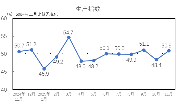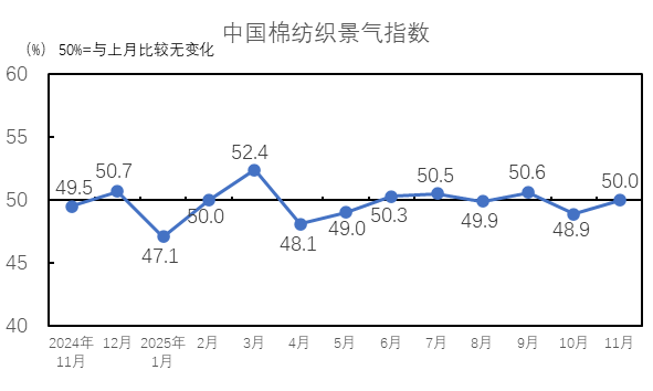 2025年11月,生产指数为50.9%,高于临界点,较10月上升2.5个百分点,纺织厂生产较10月上升。从分项指数看,棉纺织厂设备开台率指数为50.1%,高于临界点,较10月上升0.8个百分点。纱产量指数为50.3%,较10月上升1.9个百分点;布产量指数为53.8%,较10月上升7.5个百分点;纱产量指数和布产量指数均高于临界点。