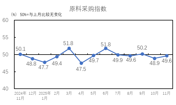 2025年11月,原料采购指数为49.6%,低于临界点,较10月上升0.7个百分点。棉花方面,11月棉价先降后涨,行业传统旺季结束叠加新棉丰产预期,及外围积极宏观情绪的降温,导致棉价在11月上旬震荡走弱,不过随后下游需求表现韧性,供需面利空预期放缓,棉价在下半月反弹修复。涤纶短纤方面,11月国际油价震荡走弱,原油供应过剩、俄乌停战谈判取得进展等消息带动原油下跌,涤纶短纤价格整体随原料震荡,月内现货价格在6350-6400元/吨窄幅波动。粘胶短纤方面,产业链均表现偏弱,淡季特征渐显,粘胶短纤价格稳中走弱,下游看跌预期增加。据TTEB数据,国内3128级棉花现货月均价14417元/吨,环比下降85元/吨,降幅0.59%;1.4D直纺涤纶短纤月均价6375元/吨,环比下降26元/吨,降幅0.41%;主流粘胶纤维月均价12959元/吨,环比下降87元/吨,降幅0.67%。从采购量看,11月棉花采购和非棉纤维采购均上升。棉花采购指数50.2%,较10月上升1.5个百分点,高于临界点;非棉纤维采购指数50.3%,较10月持平,高于临界点。