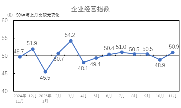 2025年11月,企业经营指数为50.9%,高于临界点,较10月上升2.0个百分点。11月,因今年气候降温较晚,传统旺季局面得到一定程度延续,下游市场韧性仍存,部分纺企订单可排产至12月底,市场整体呈“淡季不淡”态势,企业经营好转。从构成企业经营指数的分项指标看,营业收入指数为51.5%,较10月上升4.1个百分点;利润总额指数为50.3%,较10月下降0.1个百分点,营业收入指数和利润总额指数均高于临界点。