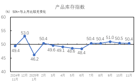 2025年11月,产品库存指数为50.4%,高于临界点,较10月下降0.1个百分点,纺织厂产品库存量下降。纱库存量指数为51.0%,较10月上升1.4个百分点;布库存量指数为49.4%,较10月下降2.5个百分点。纱库存量指数高于临界点,布库存量指数低于临界点。