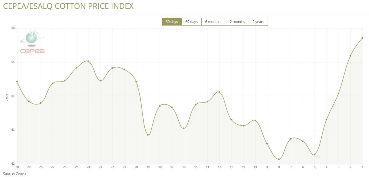 1月6日(周二),巴西CEPEA/ESALQ棉花价格指数报65.72美分/磅,较前一交易日上涨0.81%,较上月同期上涨3.81%。