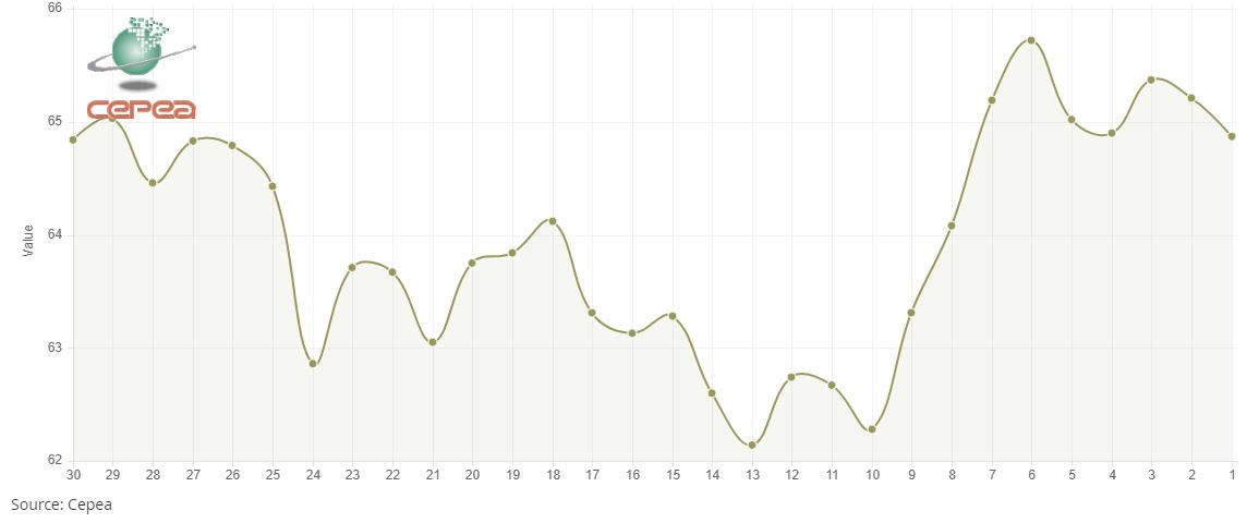 1月13日(周二),巴西CEPEA/ESALQ棉花价格指数报64.87美分/磅,较前一交易日下跌0.52%,较上月同期上涨2.46%。