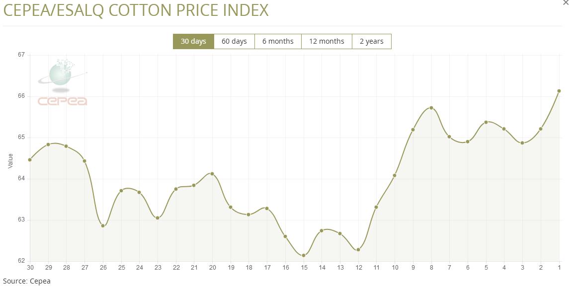 1月15日(周四),巴西CEPEA/ESALQ棉花价格指数报66.34美分/磅,较前一交易日上涨1.41%,较上月同期上涨4.44%。