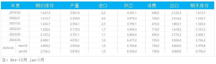 1月15日(周四),2025/26年度巴西棉花产量预估为381.82万吨,同比减少6.3%,2024/25年度为407.61万吨。