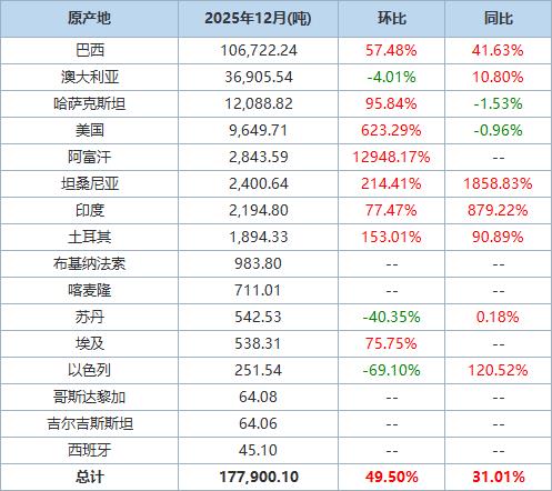 据海关统计数据,2025年12月我国进口棉花约18万吨,环比增加约6万吨,同比增长约31.0%。