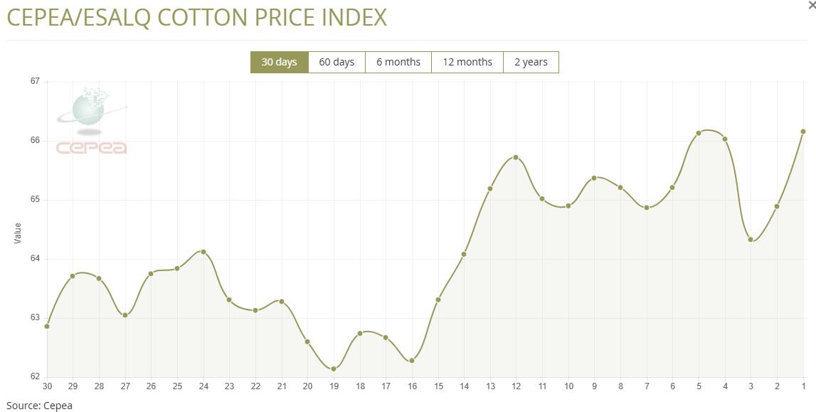 1月21日(周三),巴西CEPEA/ESALQ棉花价格指数报66.16美分/磅,较前一交易日上涨1.96%,较上月同期上涨4.50%。