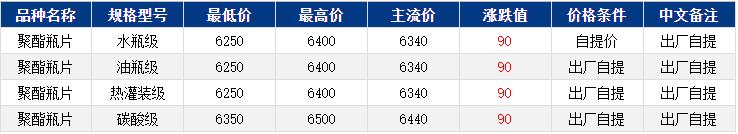 华东聚酯瓶片收于6340元/吨,涨跌值90元/吨,化工品维持上行态势,加之部分货源流通紧张,聚酯瓶片重心继续上扬。1-2月货源报盘6250-6400元/吨,递盘6200-6280元/吨,递盘以刚需买现货为主,报递盘价差较大,交投清淡。
