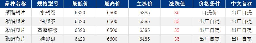 华东聚酯瓶片收于6385元/吨,涨跌值35元/吨,原油、原料继续上行,聚酯瓶片价格上扬。现货较2月货源价格略高,报盘6350-6450元/吨,略高6630元/吨,递盘6330-6350元/吨;2月货源报盘6320-6450元/吨或期货合约2604升水10-40。