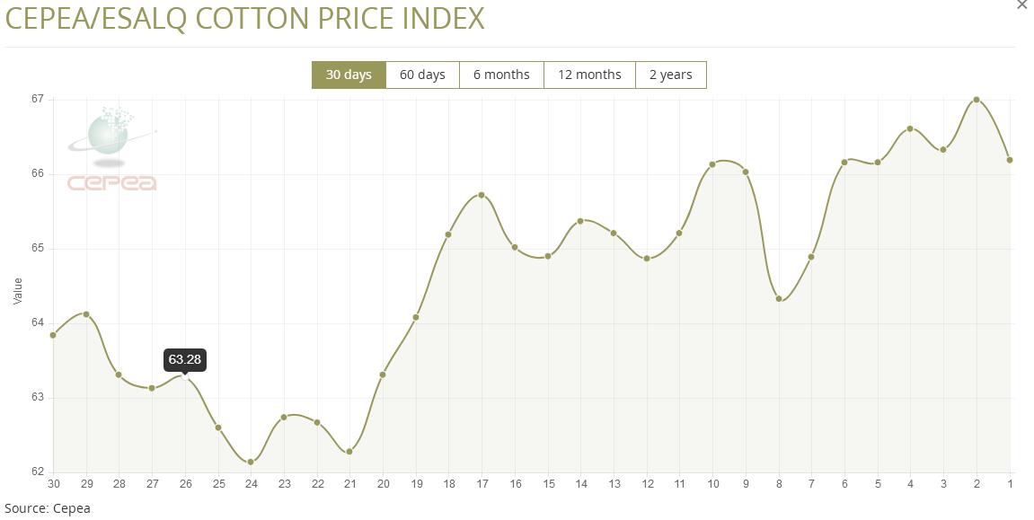 1月28日(周三),巴西CEPEA/ESALQ棉花价格指数报66.19美分/磅,较前一交易日下跌1.21%,较上月同期上涨4.55%。