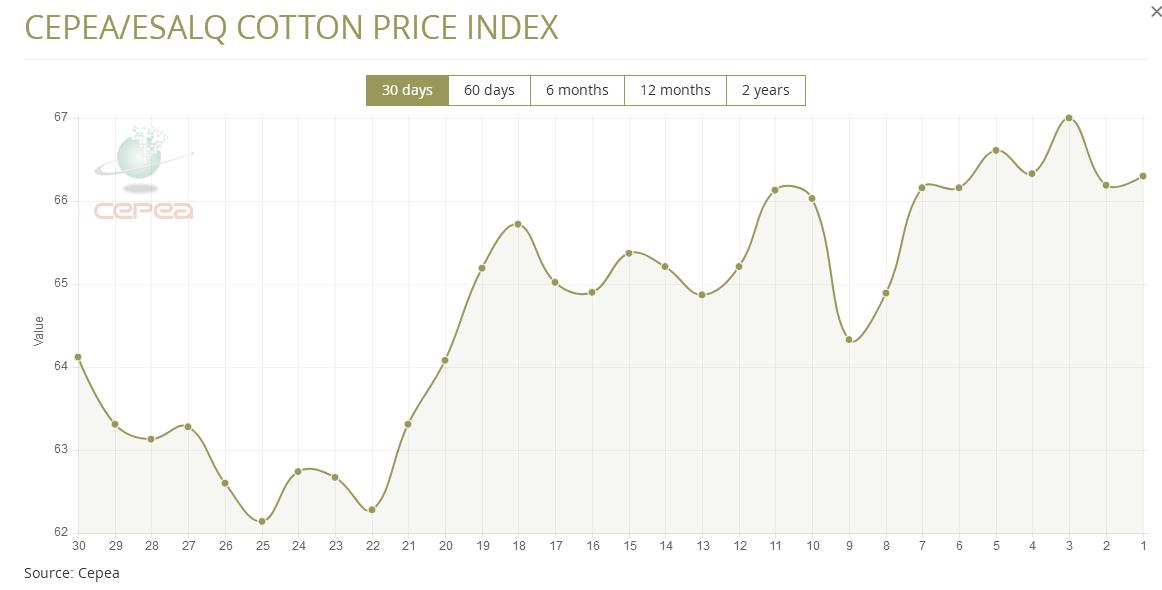 1月29日(周四),巴西CEPEA/ESALQ棉花价格指数报66.3美分/磅,较前一交易日上涨0.17%,较上月同期上涨4.72%。