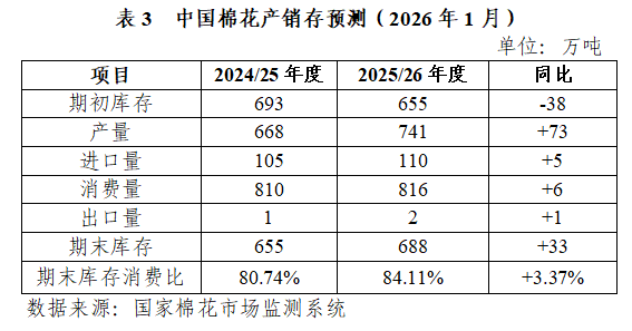 (二)从产需基本面看,本年度全球棉花供需格局延续宽松态势,下年度供需形势可能偏紧。据美国农业部2026年1月预测,本年度全球棉花产量2600万吨,同比增长0.8%;全球棉花消费量2589万吨,同比下降0.02%;全球棉花产大于需11万吨,本年度供需宽松格局未改。其中中国、巴西棉花大幅增产,印度、巴基斯坦棉花产量基本稳定,美国、澳大利亚棉花略有减产。近期,国际市场棉花交易活跃,棉花主产国出口进度较快。截至2025年11月末,本年度澳棉出口67.7万吨,同比增长11.2%,出口进度58.3%;截至12月末,巴西棉出口140.5万吨,同比增长16%,出口进度44.5%;美棉出口装运71.0万吨,同比增长10.7%,出口进度26.7%。