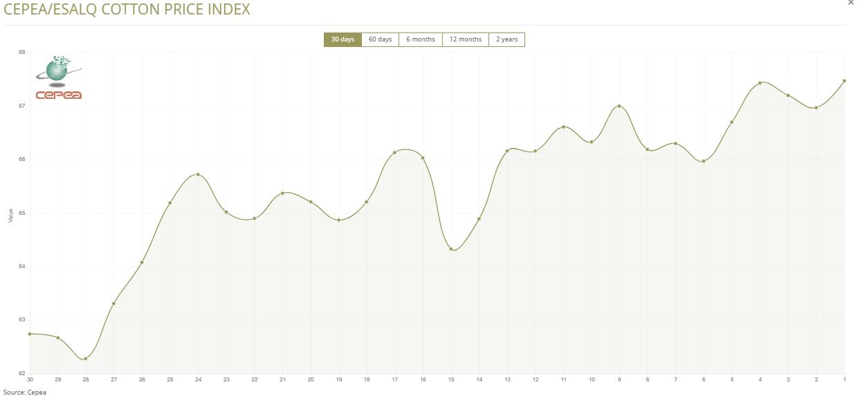 2月6日(周五),巴西CEPEA/ESALQ棉花价格指数报67.47美分/磅,较前一交易日上涨0.75%,较上月同期上涨2.27%。
