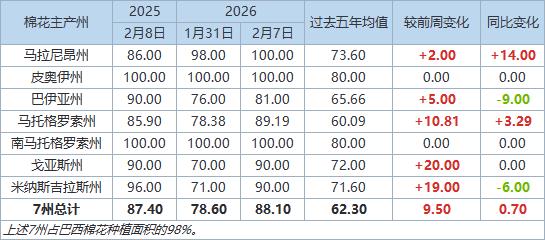 2月9日(周一),巴西国家商品供应公司(Conab)公布的数据显示,截至2月7日当周,2025/26年度巴西棉花种植率为88.1%,前周为78.6%,上年同期为87.4%,五年均值为62.3%。