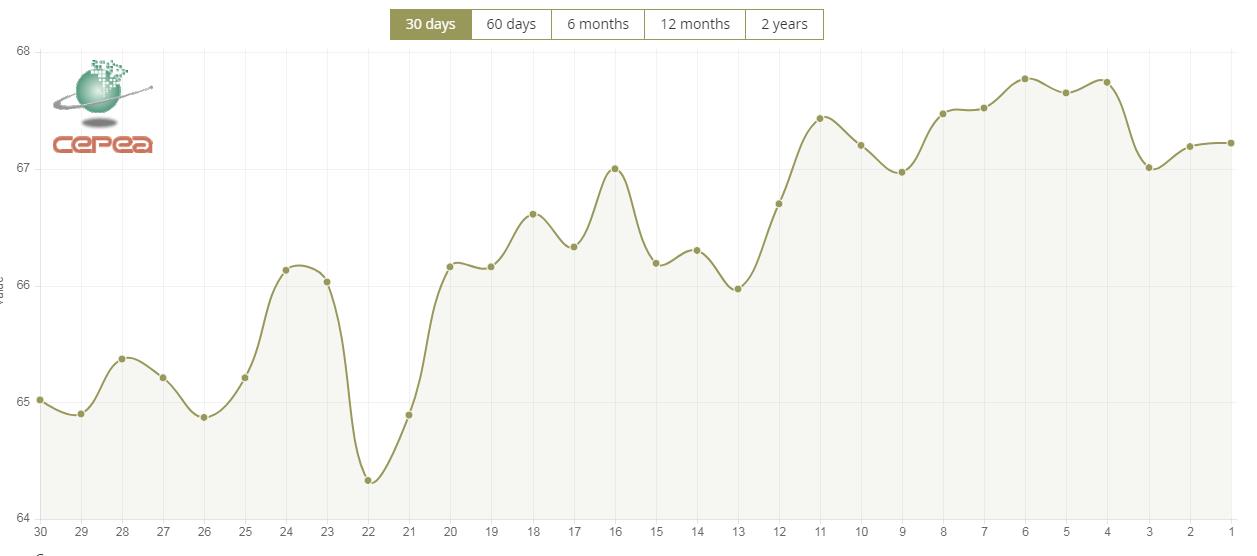 2月19日(周四),巴西CEPEA/ESALQ棉花价格指数报67.22美分/磅,较前一交易日上涨0.04%,较上月同期上涨1.89%。