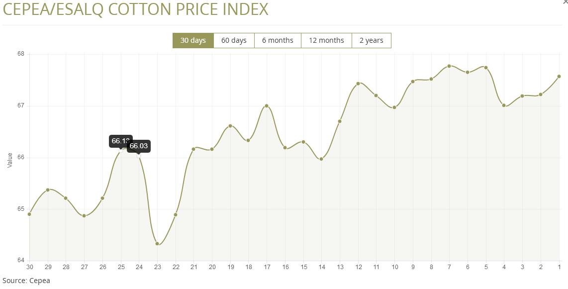 2月20日(周五),巴西CEPEA/ESALQ棉花价格指数报67.57美分/磅,较前一交易日上涨0.52%,较上月同期上涨2.43%。
