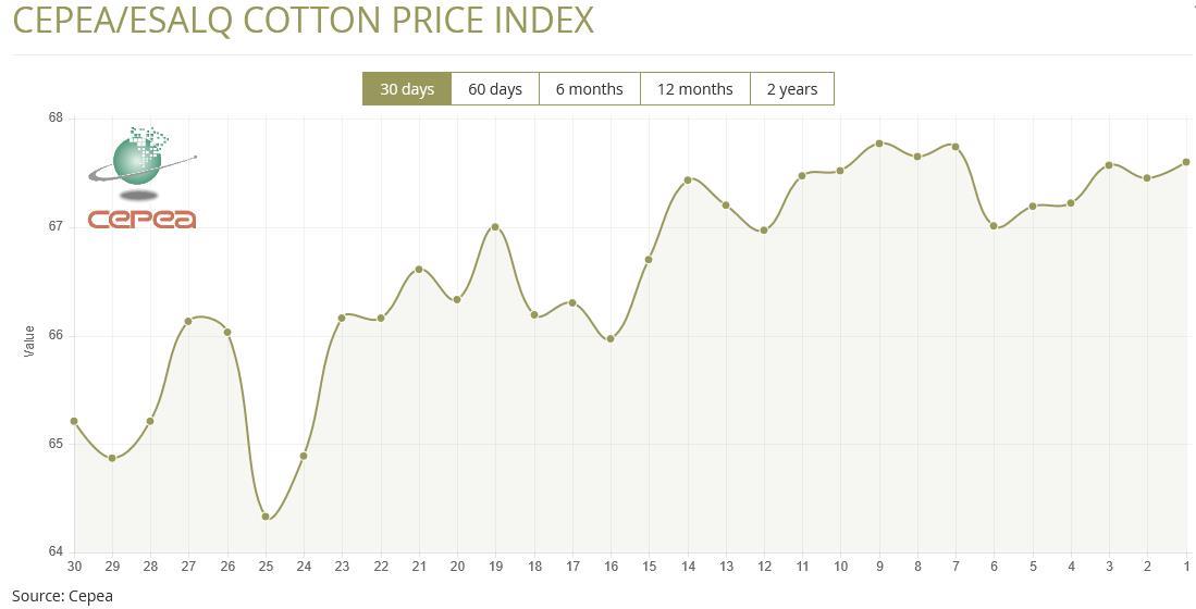 2月24日(周二),巴西CEPEA/ESALQ棉花价格指数报67.60美分/磅,较前一交易日上涨0.22%,较上月同期上涨2.47%。