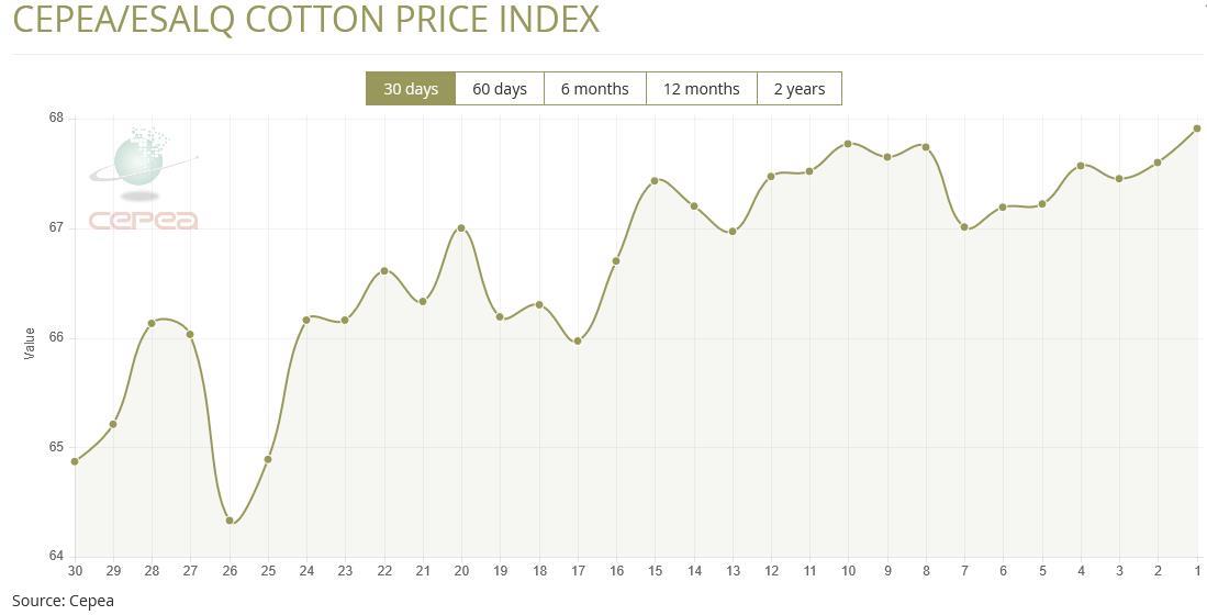 2月25日(周三),巴西CEPEA/ESALQ棉花价格指数报67.91美分/磅,较前一交易日上涨0.46%,较上月同期上涨2.94%。