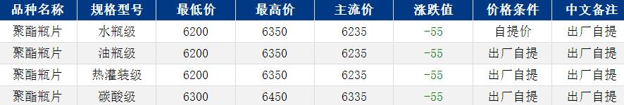 华东聚酯瓶片收于6235元/吨,涨跌值-55元/吨,美伊谈判取得良好进展,原料拖累聚酯瓶片价格继续下行,工厂报价下调50-60元/吨。2-3月货源报盘6200-6350元/吨,局部略低6130元/吨或期货合约2605升水50-90,递盘6200元/吨。