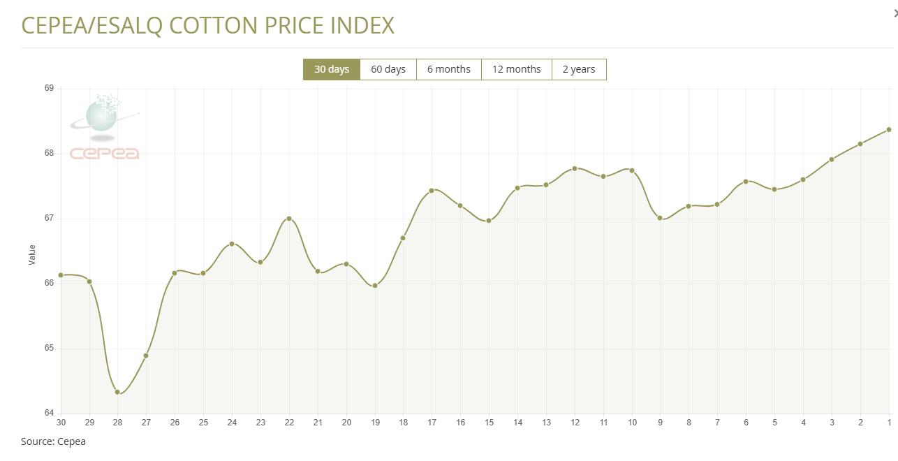 2月27日(周五),巴西CEPEA/ESALQ棉花价格指数报68.37美分/磅,较前一交易日上涨0.32%,较上月同期上涨3.64%。