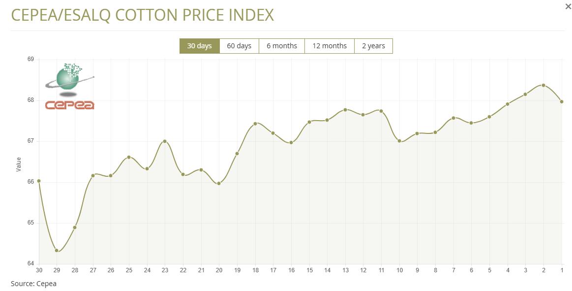 3月2日(周一),巴西CEPEA/ESALQ棉花价格指数报67.97美分/磅,较前一交易日下跌0.59%,较上月同期下跌0.59%。