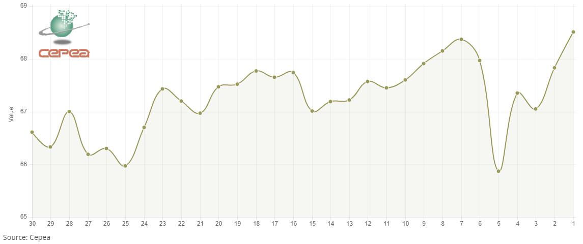 3月9日(周一),巴西CEPEA/ESALQ棉花价格指数报68.51美分/磅,较前一交易日上涨1.00%,较上月同期上涨0.20%。