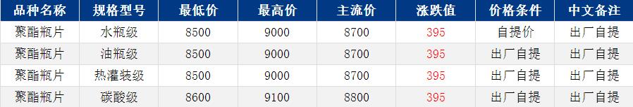 华东聚酯瓶片收于8700元/吨,涨跌值395元/吨,原油带动原料上行,聚酯瓶片随成本端上扬。3月货源报盘8600-9000元/吨,局部略低8450元/吨左右;递盘8400-8450元/吨;或期货合约2605升水150至350,品牌价差较大,行情波动剧烈,下游买气偏弱。