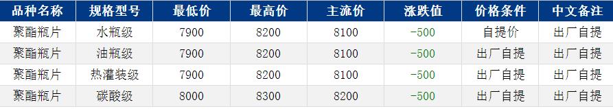 华东聚酯瓶片收于8100元/吨,涨跌值-500元/吨,原油、原料下跌,拖累聚酯瓶片价格下滑。3月货源报盘7900-8200元/吨,局部略低7800元/吨附近,零星低价递盘7900元/吨;4月货源报盘7850-8100元/吨,暂无实单递盘。