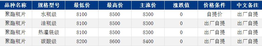 华东聚酯瓶片收于8300元/吨,涨跌值0元/吨,原料存一定支撑,聚酯瓶片工厂多报稳,重心僵持整理。3-4月货源报盘8100-8500元/吨,局部略低8050元/吨附近。零星实单递盘8050元/吨,业内观望情绪浓厚。