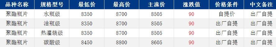 华东聚酯瓶片收于8505元/吨,涨跌值90元/吨,原料支撑,聚酯瓶片工厂报价上调200元/吨,部分现货供应紧张,市场重心随之上扬。3-4月货源报盘8350-8700元/吨,零星递盘8450元/吨。担忧行情会有反复,下游买气偏弱,谨慎观望为主。