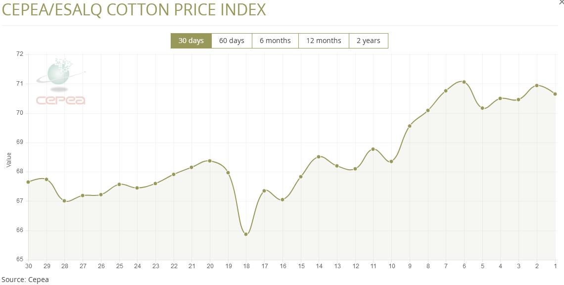 3月26日(周四),巴西CEPEA/ESALQ棉花价格指数报70.65美分/磅,较前一交易日下跌0.41%,较上月同期上涨3.33%。