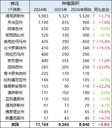 美国农业部(USDA)周二公布的种植意向报告显示,2026年美国所有棉花种植面积预估为964.0万英亩,市场预期为922.9万英亩。2025年实际种植面积为928.3万英亩。