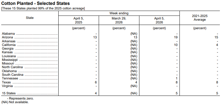 据美国农业部网站消息,美国农业部(USDA)在每周作物生长报告中公布称,截至2026年4月5日当周,美棉种植率为5%,去年同期为4%,五年均值为5%。