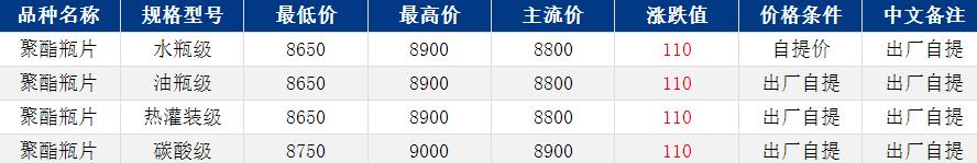 华东聚酯瓶片收于8800元/吨,涨跌值110元/吨,原油带动原料继续上行,聚酯瓶片重心跟涨。4月主流货源报盘8650-8900元/吨,部分报盘8550-8600元/吨或期货合约2605升水300-350,部分略低升水80;零星递盘8600元/吨,业内观望情绪浓厚,交投清淡。