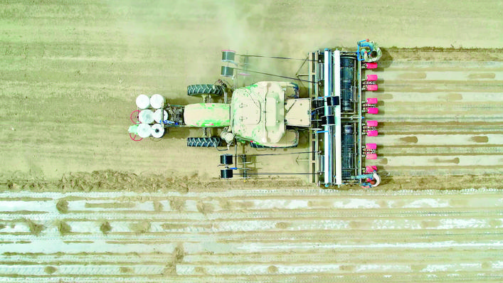 在沙雅县海楼镇博孜墩村,1台台大型精量播种机来回穿梭,在田间匀速作业,伴随着机械的轰鸣,1粒粒棉种精准播入土壤,铺设地膜、滴灌带培土等同时完成。“现在棉花种植全程实现机械化,真是省时省力。”棉农张磊说,这几年他通过科学种植,棉花产量和品质逐年提升,他对今年的收成充满信心。
