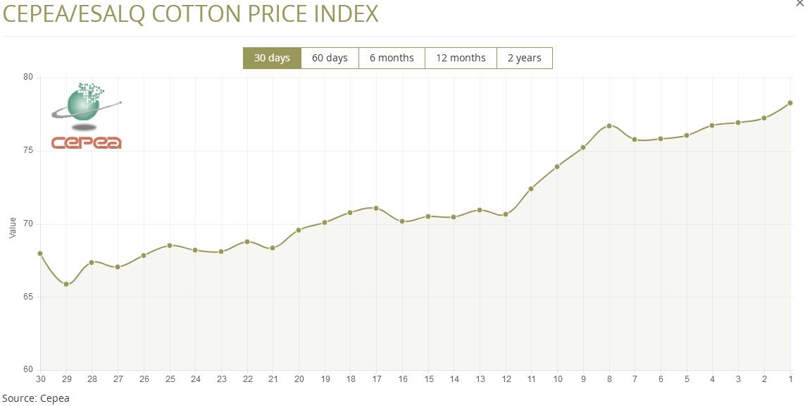4月13日(周一),巴西CEPEA/ESALQ棉花价格指数报78.26美分/磅,较前一交易日上涨1.33%,较上月同期上涨4.04%。
