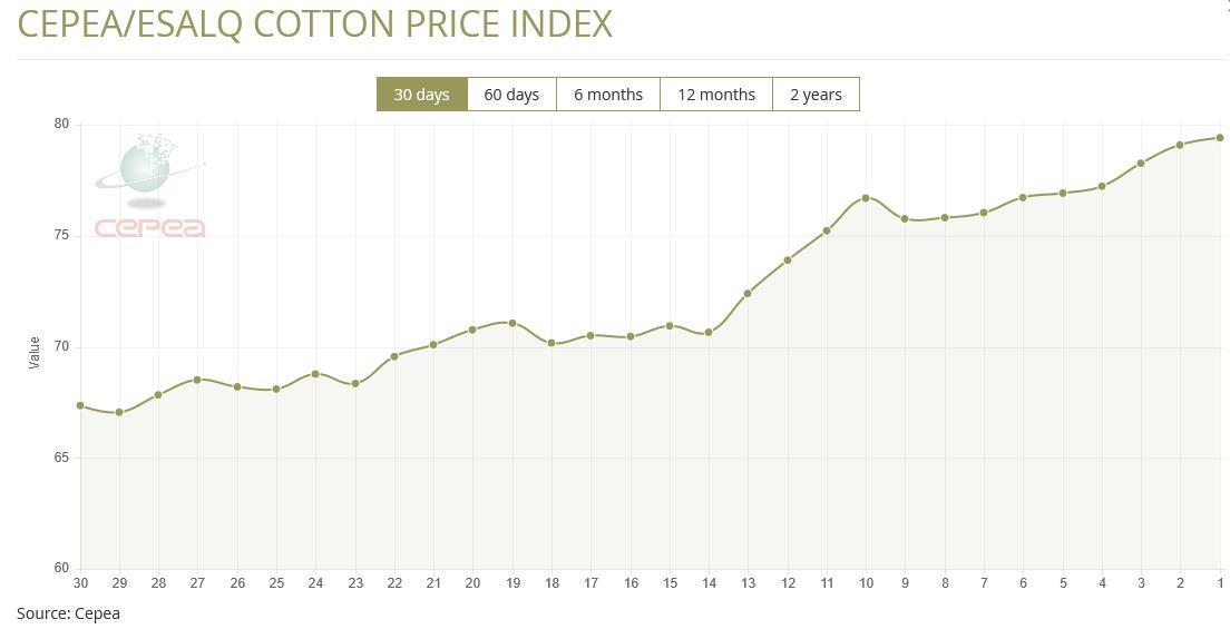 4月15日(周三),巴西CEPEA/ESALQ棉花价格指数报79.41美分/磅,较前一交易日上涨0.40%,较上月同期上涨5.57%。