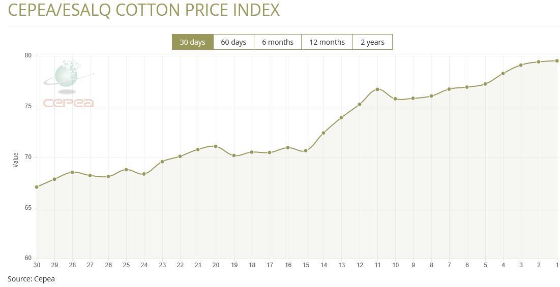4月16日(周四),巴西CEPEA/ESALQ棉花价格指数报79.51美分/磅,较前一交易日上涨0.13%,较上月同期上涨5.70%。
