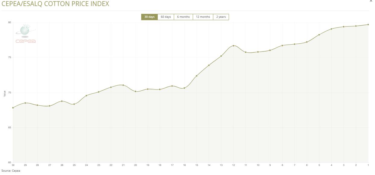 4月17日(周五),巴西CEPEA/ESALQ棉花价格指数报79.72美分/磅,较前一交易日上涨0.26%,较上月同期上涨5.98%。