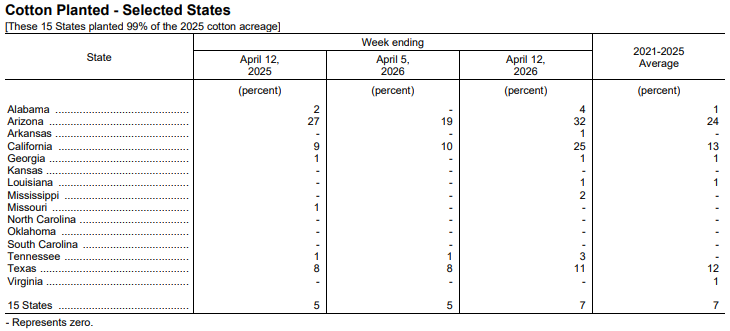 据美国农业部网站消息,美国农业部(USDA)在每周作物生长报告中公布称,截至2026年4月19日当周,美棉种植率为11%,前周为7%,去年同期为10%,五年均值为10%。