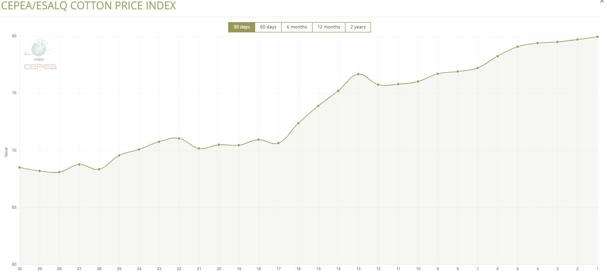 4月20日(周一),巴西CEPEA/ESALQ棉花价格指数报79.96美分/磅,较前一交易日上涨0.3%,较上月同期上涨6.3%。