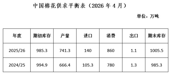 中国棉花协会预测:2025/26年度全国棉花产量741.3万吨,同比增长11.2%;进口量140万吨,同比增长33%;消费量860万吨,同比增长10.3%;出口1.1万吨,同比下降15.4%;期末库存1005.5万吨,同比增长2.1%。
