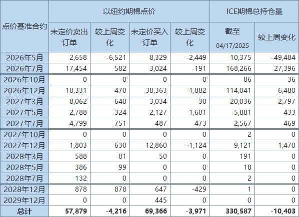 所有期棉合约点价未定价卖出订单共57879手,较前周减少4216手。