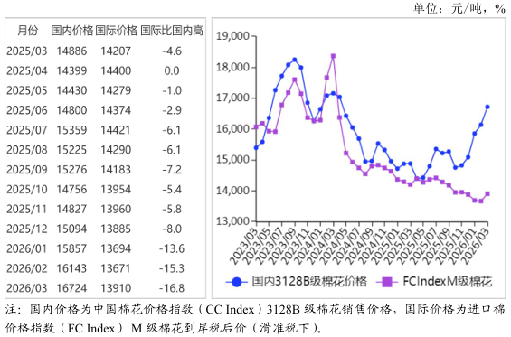 (一)国内棉价上涨。纺织行业进入传统“金三银四”旺季,下游产品订单增加,企业棉花采购意愿增强。据《中国棉花工业库存调查报告》采购意向调查数据,截至3月初,准备采购棉花的企业占53.9%,环比增7.4个百分点,同比增1.1个百分点,比近5年同期平均水平减2.0个百分点。3月,国内3128B级棉花月均价每吨16724元,环比涨3.6%,同比涨12.3%。郑棉期货主力合约CF605月结算价每吨15405元,环比涨0.5%,同比涨13.4%。