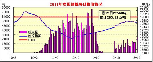 3月12日计划收储90800吨,实际成交27560吨,是两节后成交最多的一天,成交比例30%。其中新疆库点计划收储24800吨,实际成交5840吨,成交比例24%;内地库计划收储66000吨,实际成交21720吨,成交率33%。截止今日2011年度棉花临时收储累计成交2832060吨,新疆累计成1590360吨。
