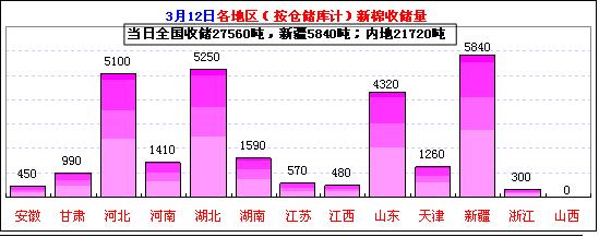 按仓储库收储地区汇总:当日收储较多的地区有:新疆5840吨,占21.2%,湖北5250吨,占19%,河北5100吨,占18.5%,山东4320吨,占15.7%,湖南1590吨,占5.8%等。截止3月12日,新疆库累计收储159.04万吨,占56.2%、山东33.37万吨,占11.8%、湖北32.15万吨,占11.4%、河北22.52万吨,占8.0%等。