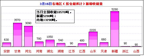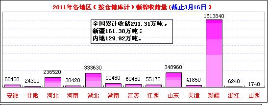 3月16日计划收储87200吨,实际成交18570吨,成交比例21%。其中新疆库点计划收储26000吨,实际成交5280吨,成交比例20%;内地库计划收储61200吨,实际成交13290吨,成交率22%。截止今日2011年度棉花临时收储累计成交2913080吨,新疆累计成交1613840吨,内地累计成交1299240吨。