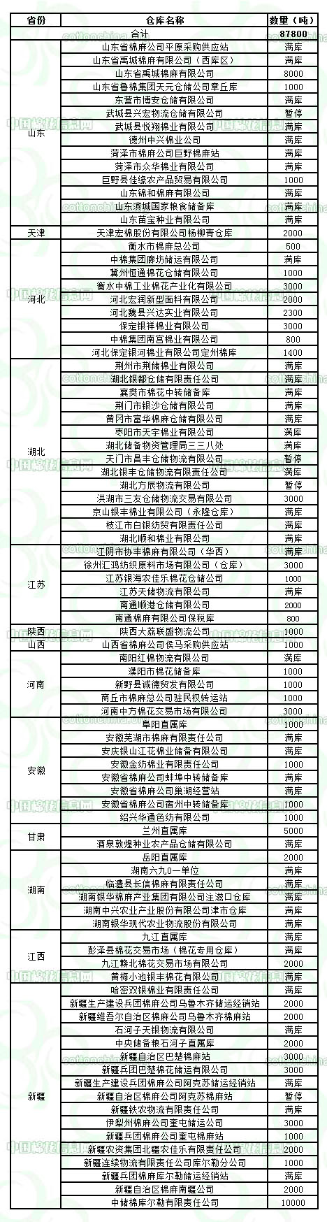 3月20日在以下指定仓库收储2011年度棉花87800吨。