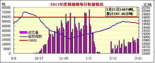 3月21日计划收储87200吨,实际成交14670吨,成交比例17%。其中,新疆库点计划收储33000吨,实际成交7200吨,成交率22%;内地库计划收储54200吨,实际成交7470吨,成交率14%。截止今日2011年度棉花临时收储累计成交2977960吨,新疆累计成交1643080吨,内地累计成交1334880吨。