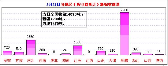 按仓储库收储地区汇总:当日收储较多的地区有:新疆7200吨,占49.1%,河北2550吨,占17.4%,江苏1560吨,占10.6%等。截止3月21日,新疆库累计收储164.31万吨,占55.2%、山东35.49万吨,占11.9%、湖北33.56万吨,占11.3%、河北24.40万吨,占8.2%等。