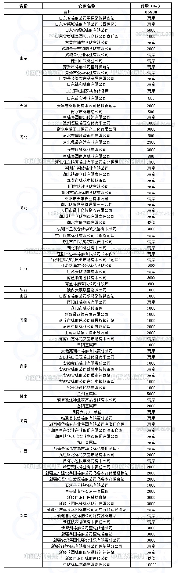 3月27日在以下指定仓库收储2011年度棉花85500吨。